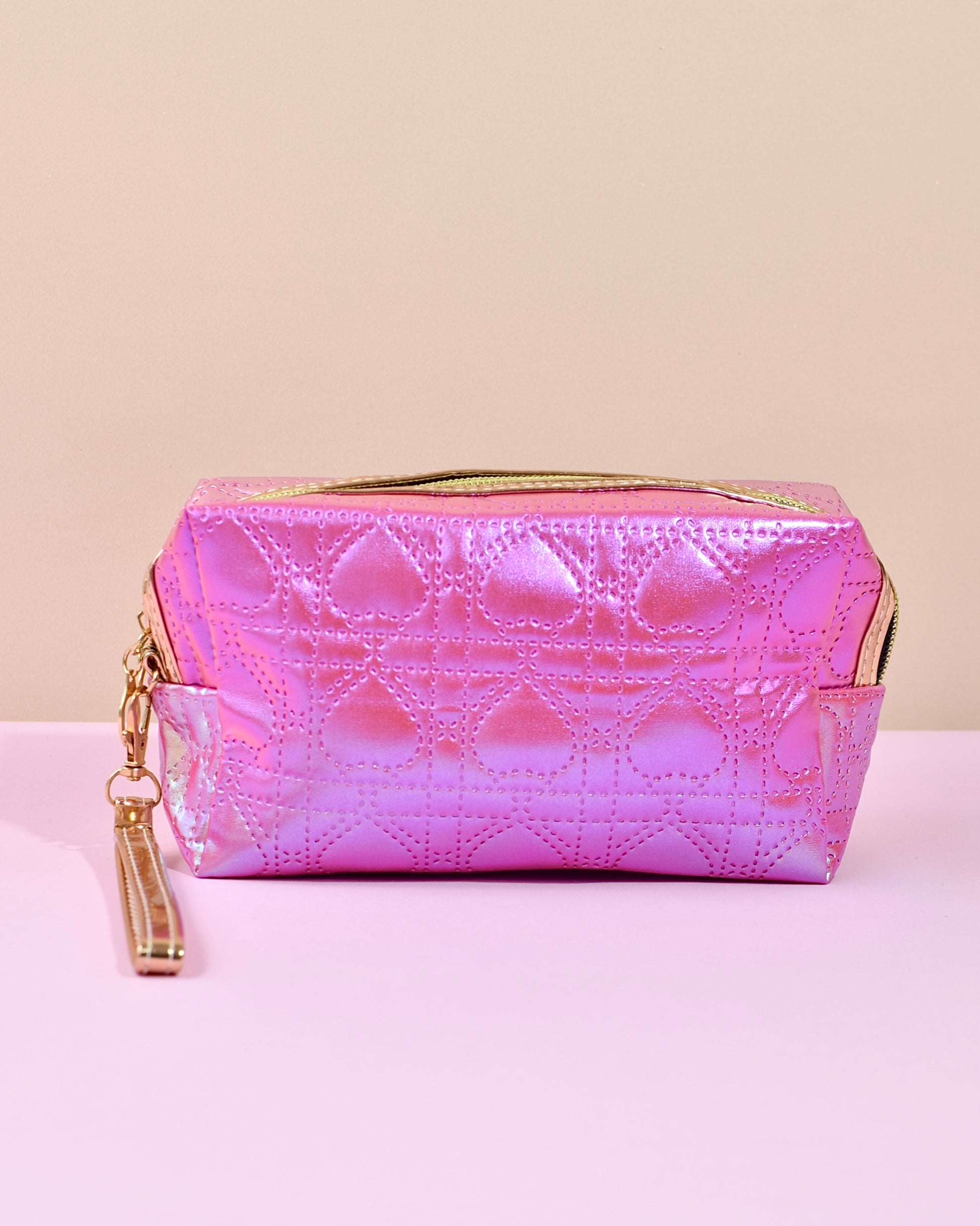 Dale un upgrade a tu rutina con esta cosmetiquera que roba miradas. Su diseño holográfico en tonos rosados con textura de corazones y cierre dorado la convierten en el accesorio perfecto para llevar tu makeup y skincare con estilo.